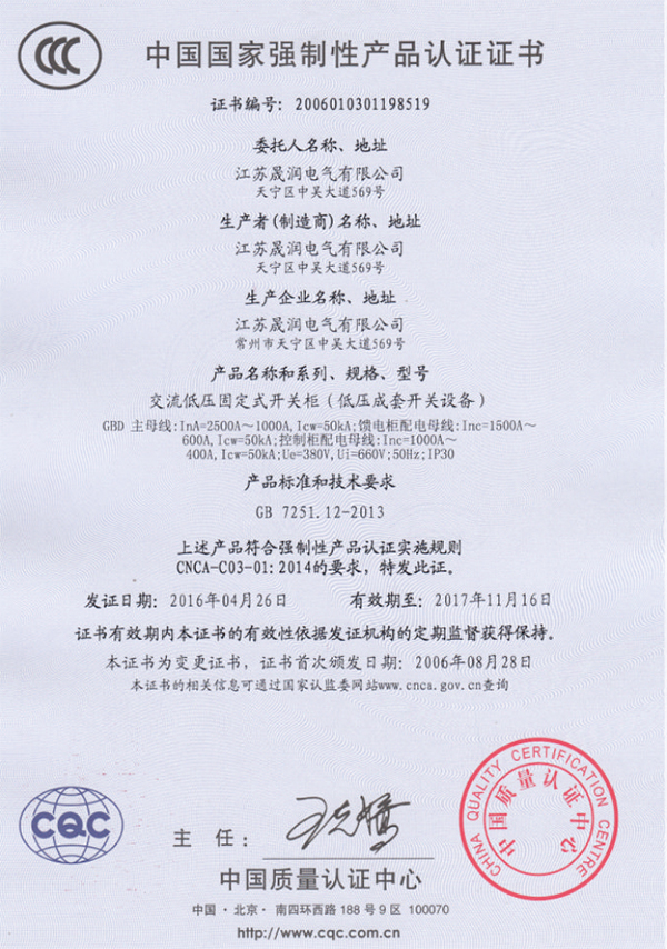 交流低压固定式开关柜(低压成套开关设备)产品认证证书