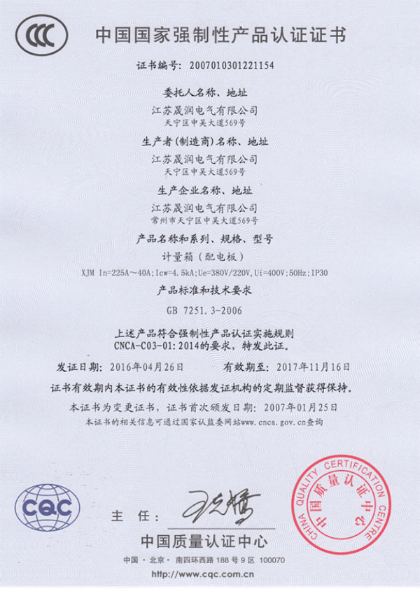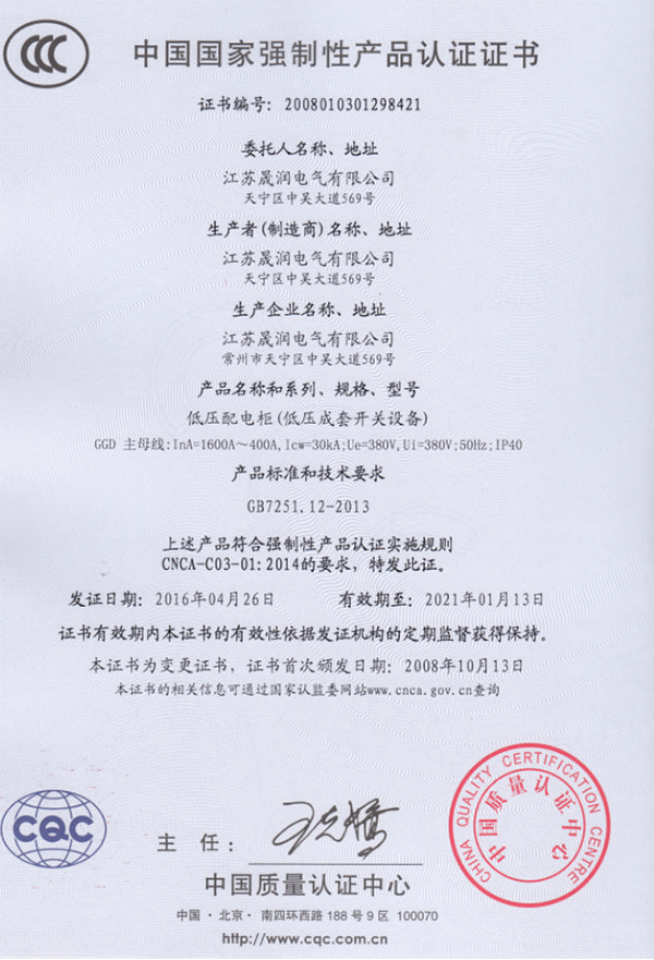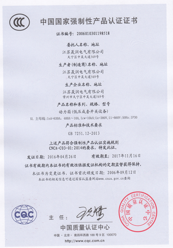 低压配电柜(低压成套开关设备)产品认证证书