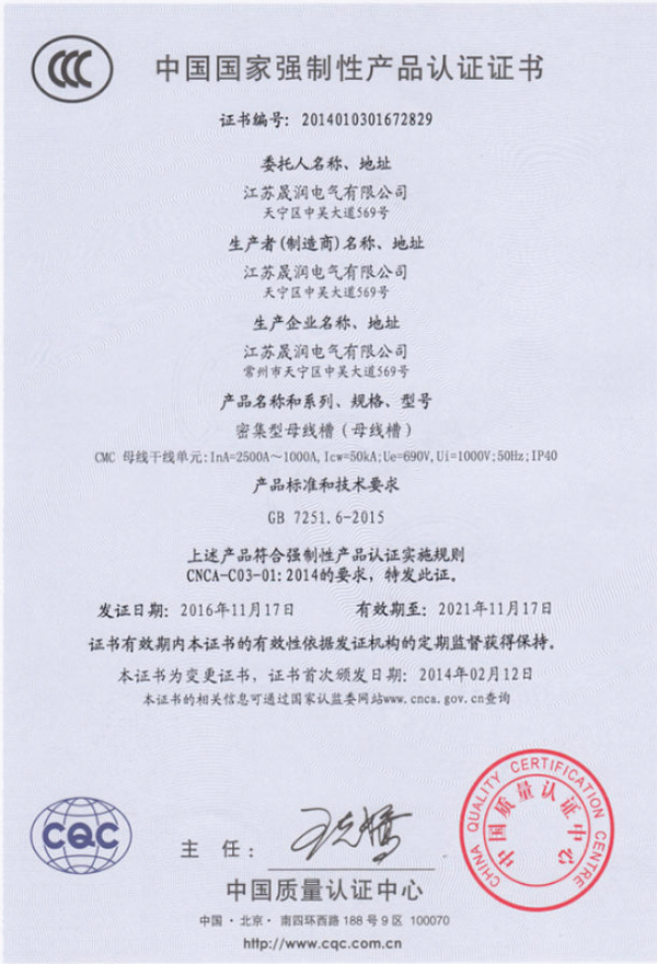 密集型母线槽(母线槽) 产品认证证书
